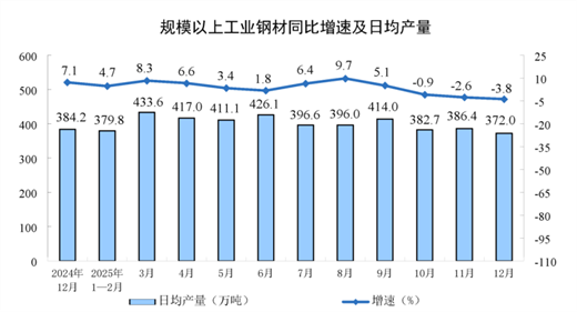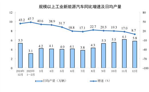 分產(chǎn)品看,12月份,規(guī)模以上工業(yè)623種產(chǎn)品中有325種產(chǎn)品產(chǎn)量同比增長。其中,鋼材11531萬噸,同比下降3.8%;水泥14416萬噸,下降6.6%;十種有色金屬721萬噸,增長4.9%;乙烯356萬噸,增長3.0%;汽車341.2萬輛,下降2.8%,其中新能源汽車179.1萬輛,增長8.7%;發(fā)電量8586億千瓦時,增長0.1%;原油加工量6246萬噸,增長5.0%。
