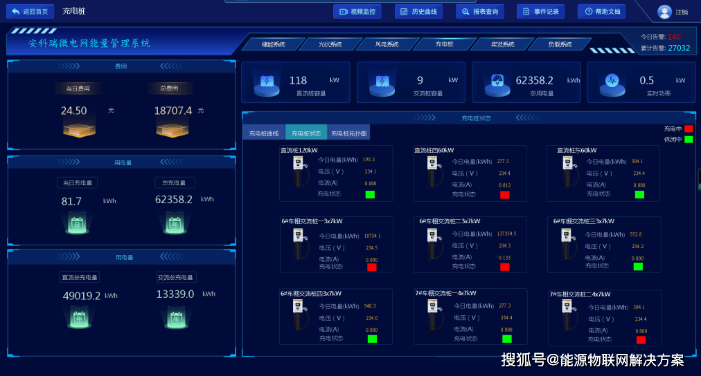 展示對(duì)充電樁系統(tǒng)信息,主要包括充電樁用電總功率、交直流充電樁的功率、電量、電量費(fèi)用,變化曲線、各個(gè)充電樁的運(yùn)行數(shù)據(jù)等。